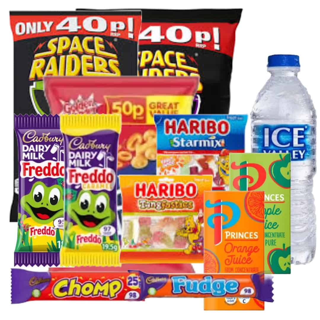 Snack pack per guest, including a packet of crisps, mini sweet snack and fruit juice carton.