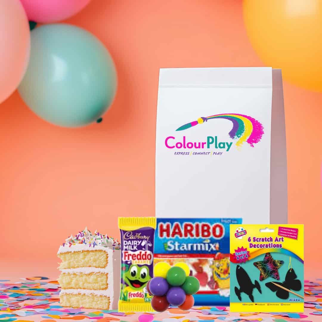 As an optional extra, we can add Party Gift Bags for each child.  Each Party Bag includes a mini sweet snack, fidget toy, “art at home” pack, and a piece of cake (provided by booking customer as above).